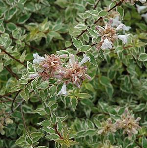 These Abelia both have white summer flowers with the Radiance Abelia being the more fragrant. The Kaleidoscope has yellow and green variegation becoming red and orange in the fall while the Radiance has slivery-green foliage edged in cream and white. They both are evergreens and compact growers.